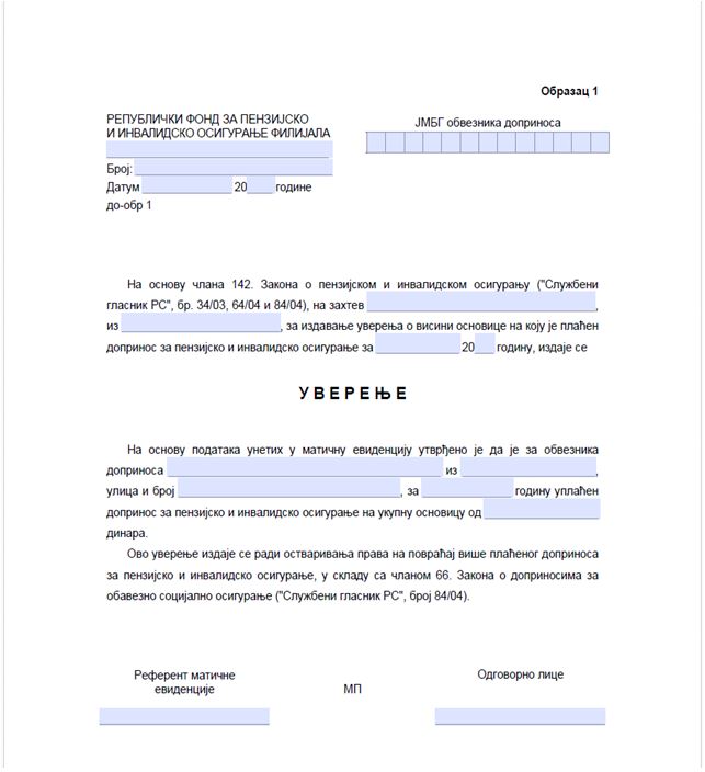Na osnovu raspoloživih podataka, organizacija za obavezno penzijsko i invalidsko osiguranje kod koje se obveznik vodi kao osiguranik u matičnoj evidenciji, u roku od 15 dana od dana podnošenja zahteva izdaje Uverenje o osnovici na koju je plaćen doprinos na Obrascu 1.